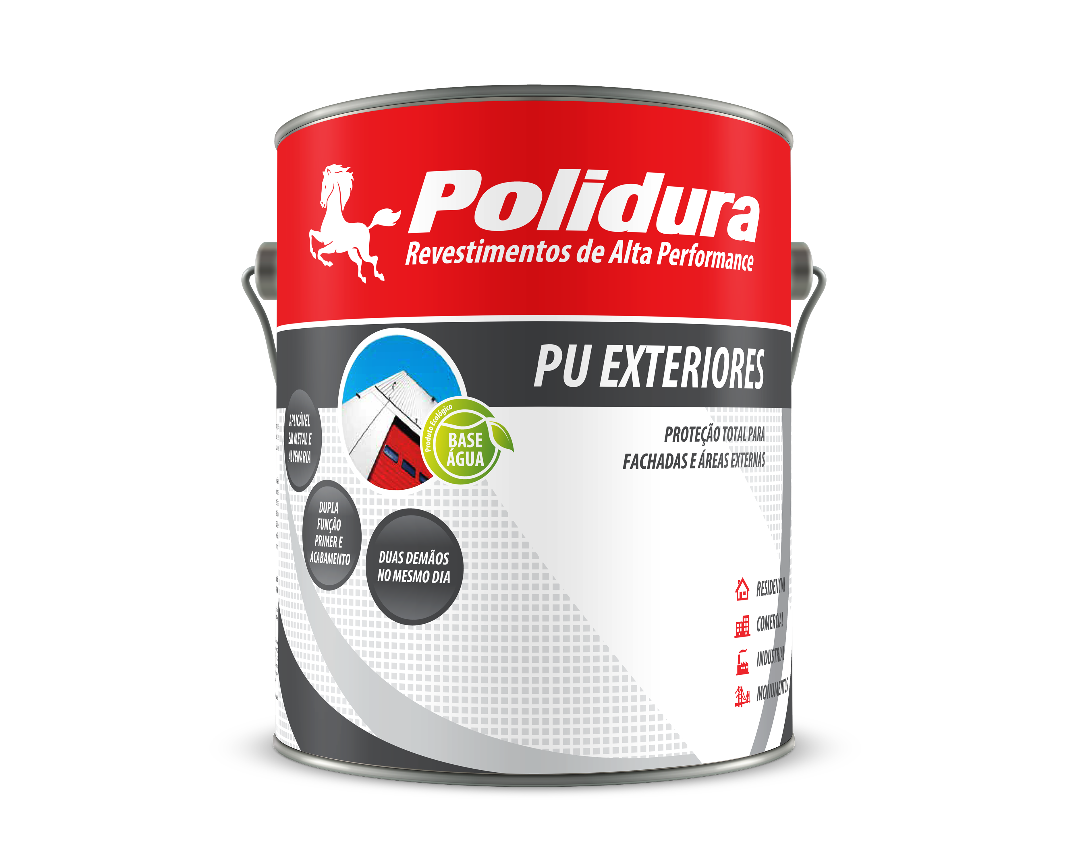 Polidura PU Exteriores utiliza em sua composição matérias primas especialmente selecionadas, produzindo um filme protetor com excelente resistência química e física. As sujidades e poluição presentes no meio ambiente não impregnam na tinta, facilitando a limpeza e mantendo fachadas e muros sempre com aspecto de novos. Produto com tecnologia a base de água, apresentando baixo odor e baixa emissão de compostos orgânicos voláteis (VOC).